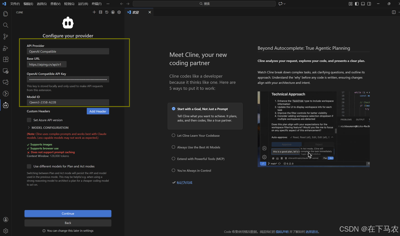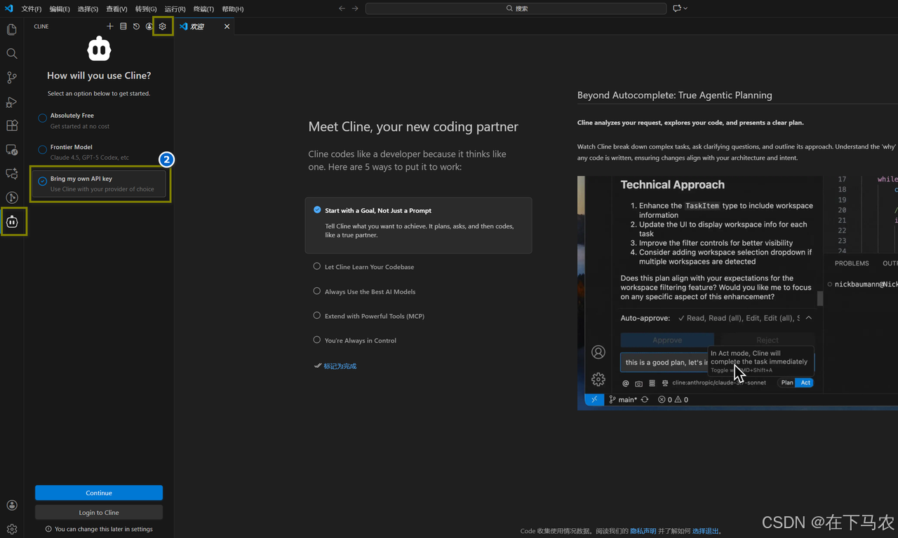 第一次使用会默认进入Cline的配置界面,也可以通过点击Cline图标后点击Cline界面右上角设置按钮进入配置界面,我们在Cline的配置界面选择第三个bring my own API key(下图中②的位置),然后点击continue进入配置界面。