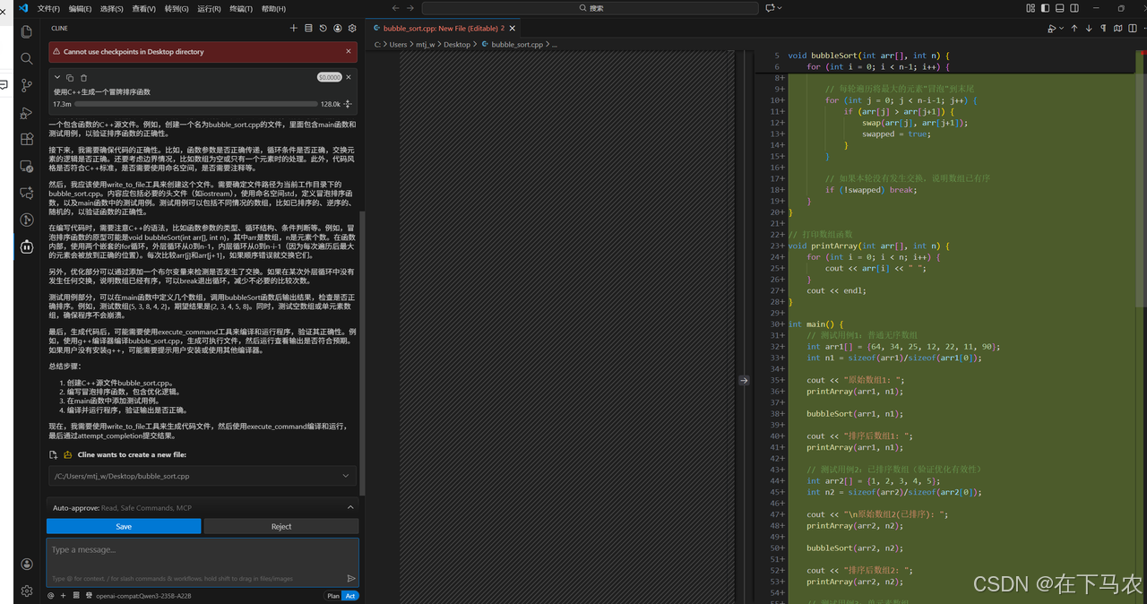我们让大模型使用C++生成一个冒泡函数。以下是运行效果: