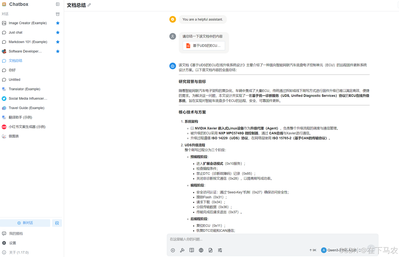 在chatbox输入框中选择一个文档,让大模型帮我们总结文档的内容,运行效果如下: