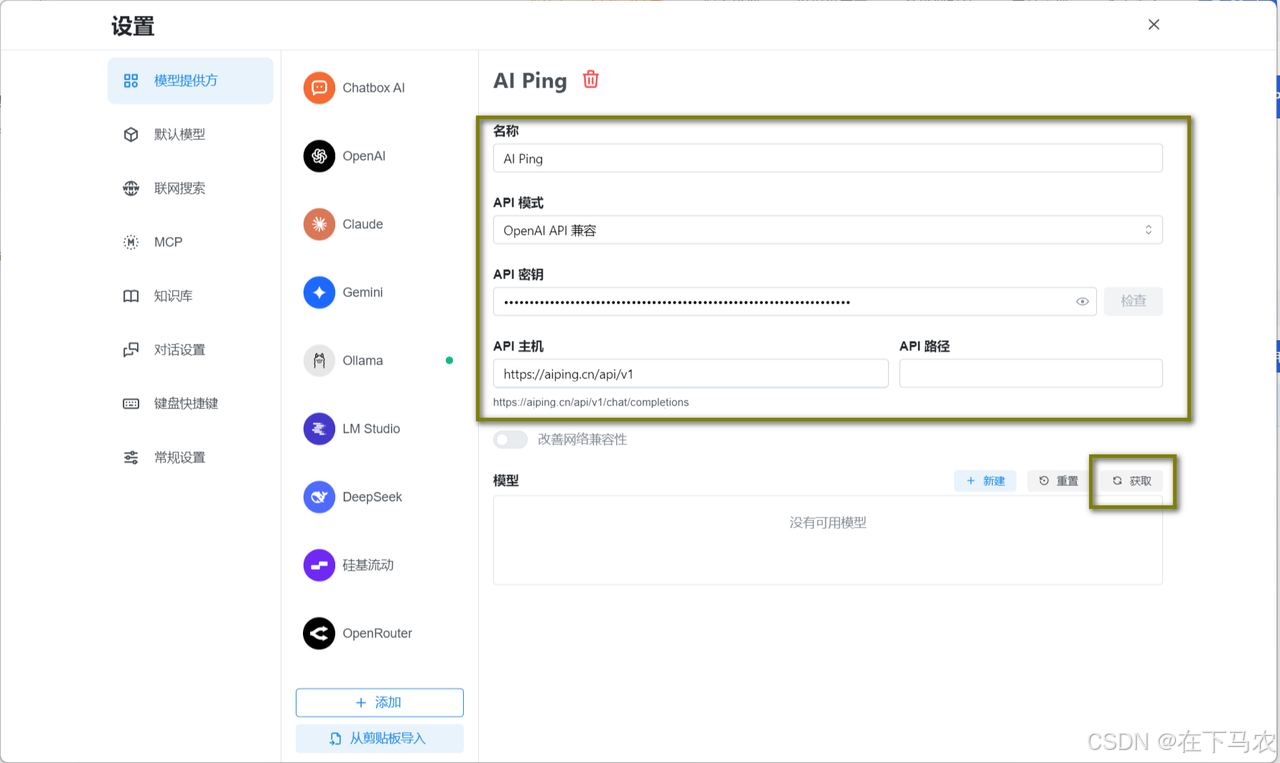 将AIPing的Base url和API key分别填入API主机和API密钥输入框中。
