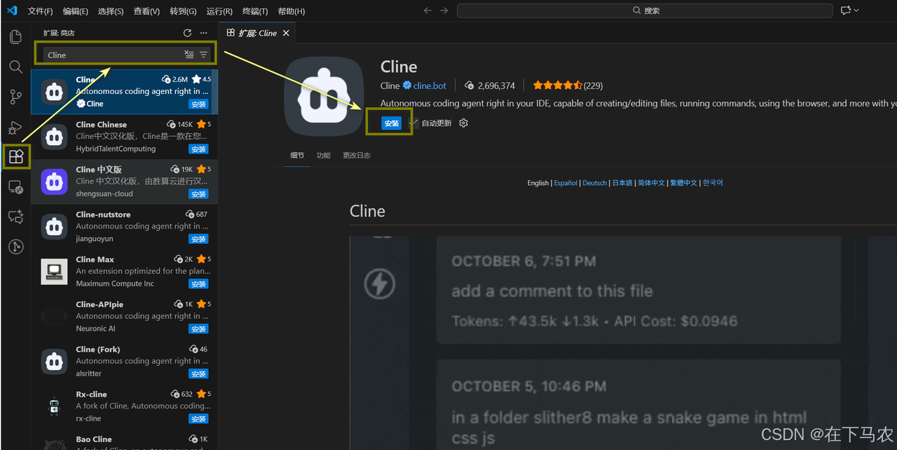 在VSCode左侧导航栏点击扩展,然后在搜索框搜索Cline,最后点击安装。