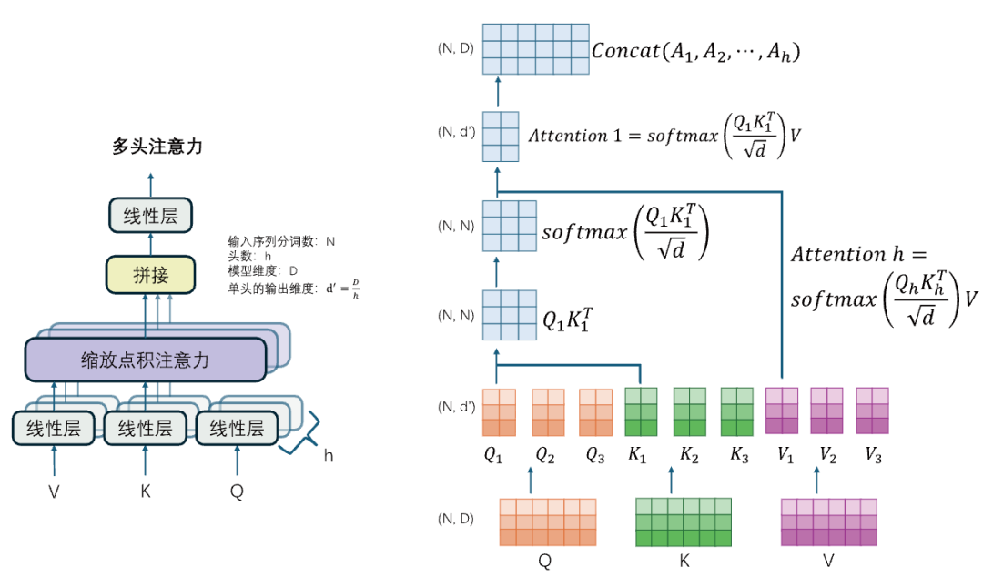 在实际的操作中,会把QKV矩阵分别经过线性层处理,得到符合形状的输入矩阵,再经过注意力公式计算即可。下图是多头注意力的详细示意图: