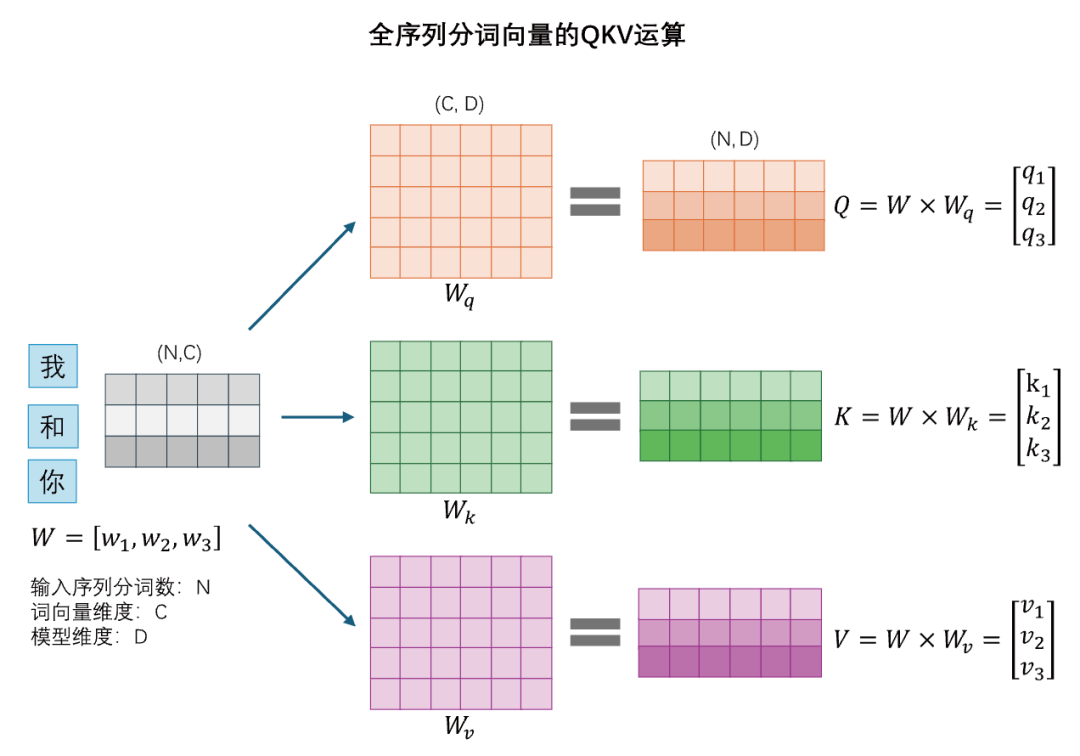 我们利用矩阵运算的性质,将输入的序列的N个词“打包”成一个矩阵,可以同样并行计算所有词的query、key、value向量,而得到了三个新矩阵,分别为Q、K、V矩阵。示意图如下: