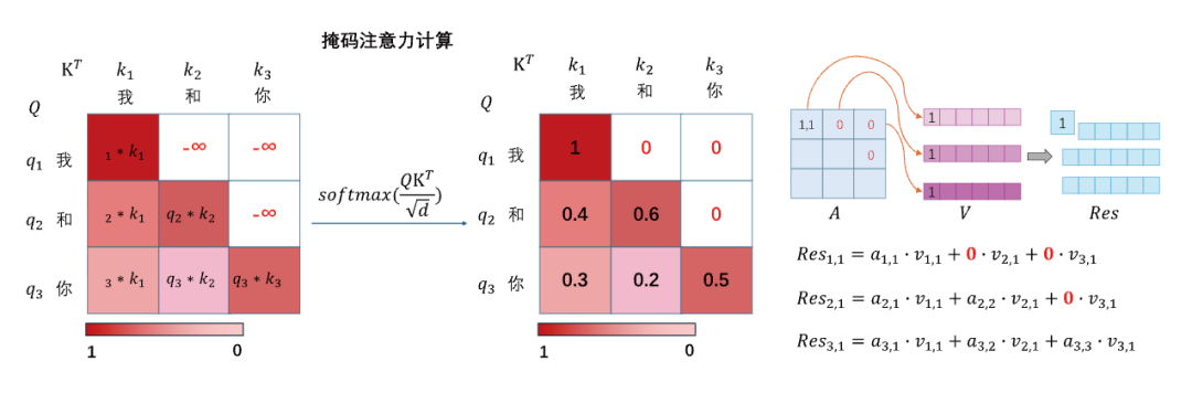 在QK矩阵计算相似度时,人为地把结果矩阵地上三角部分设为,这样在经过后,上三角部分全变为0,再计算注意力时,可以看到第一个字符“我”向量与矩阵相乘时,后两个字符相似度为0,结果中只包含“我”向量地信息;第二个字符“和”相乘时,只包含“我”、“和”两个字符的信息;最后,“你”字符相乘时,将包含全部上下文信息。