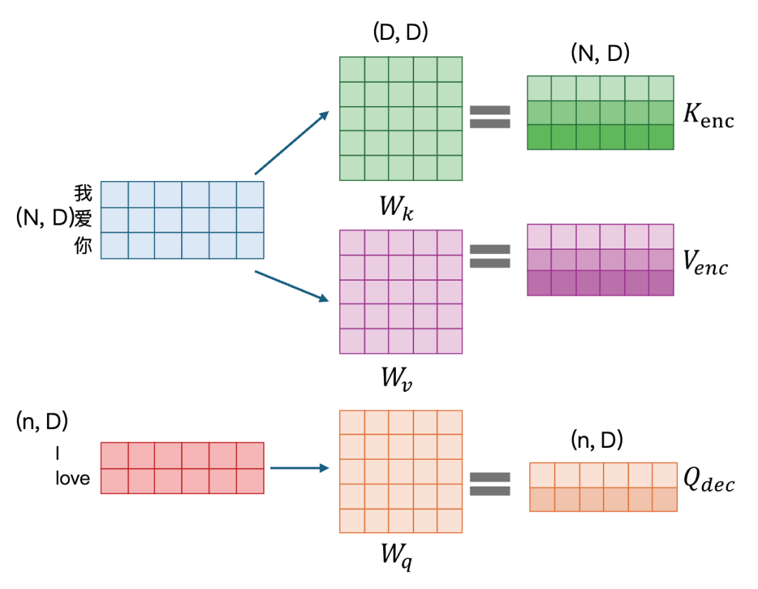 例如,编码器得到的矩阵让每个输入词向量带上了输入序列的上下文;解码器掩码注意力输出的矩阵让已生成的个词向量带上了它的上下文;那么交叉注意力的权重矩阵、、的形状都是,得到QKV是: