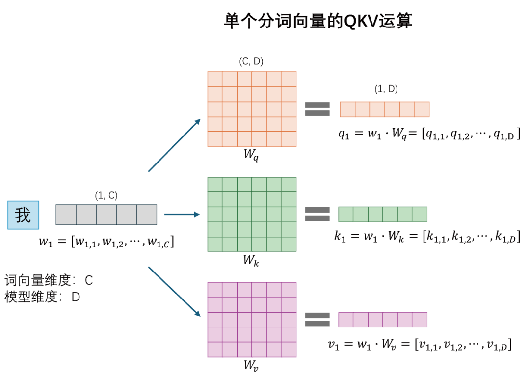 QKV矩阵的计算是注意力的核心,首先说明单个字词的注意力计算,示意图如下: