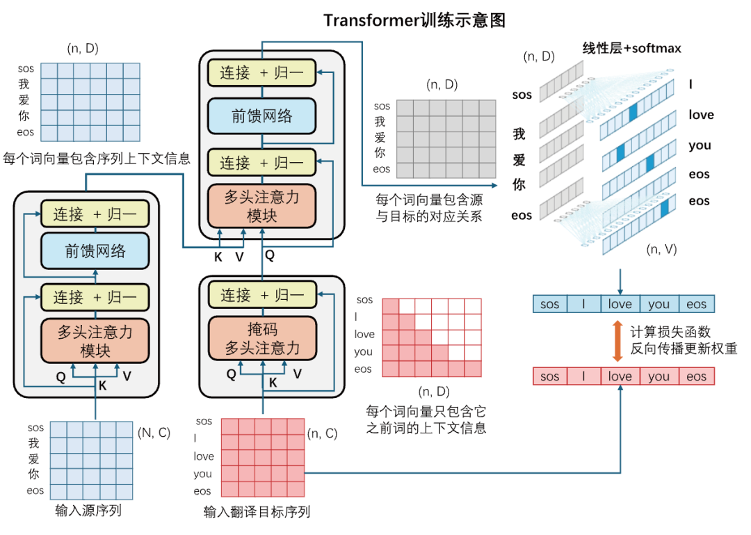 通过计算损失,利用反向传播算法将损失值反向传播到整个Transformer模型,更新模型中的可训练参数,使模型预测结果不断接近真实目标序列,提升模型性能。在实际应用中,还可能结合一些正则化方法(如L1、L2正则化)来防止模型过拟合,进一步优化训练效果。