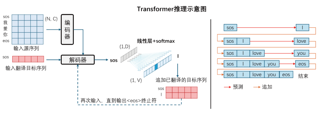 模型训练完成后进行推理,此时只知道输入序列<我爱你>,需要模型自己来判断生成序列<I love you>,这时需要自回归逐词生成: