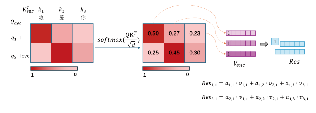 最后用来计算注意力,相当于加权求和,,形状为。该矩阵的每一行,对应解码器中 “已生成的第 i 个目标词”,而行向量的每一个维度,则融合了编码器中与该目标词语义相关的源序列信息。
