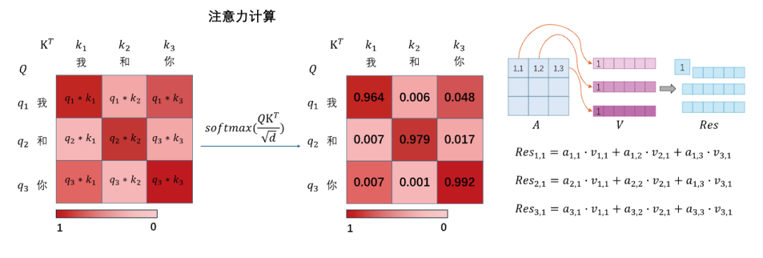 对于形状为的QKV矩阵来说,作为查询矩阵和键矩阵的转置做矩阵乘法,计算得到一个方阵,这个方阵的每个元素表示的相似度,或者说受哪个的上下文影响最大。