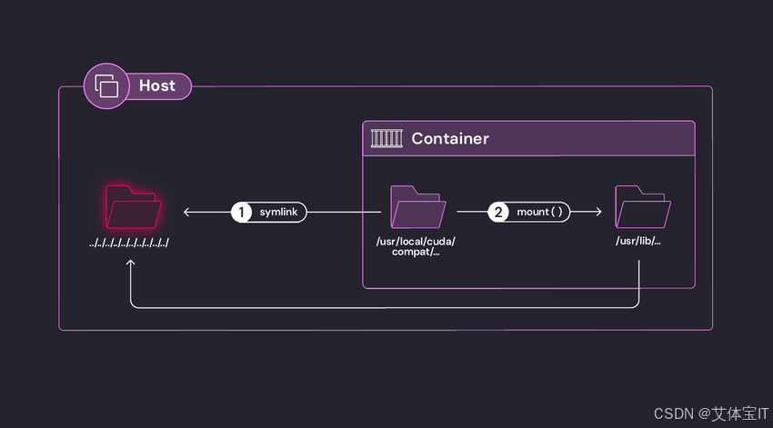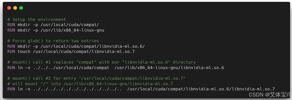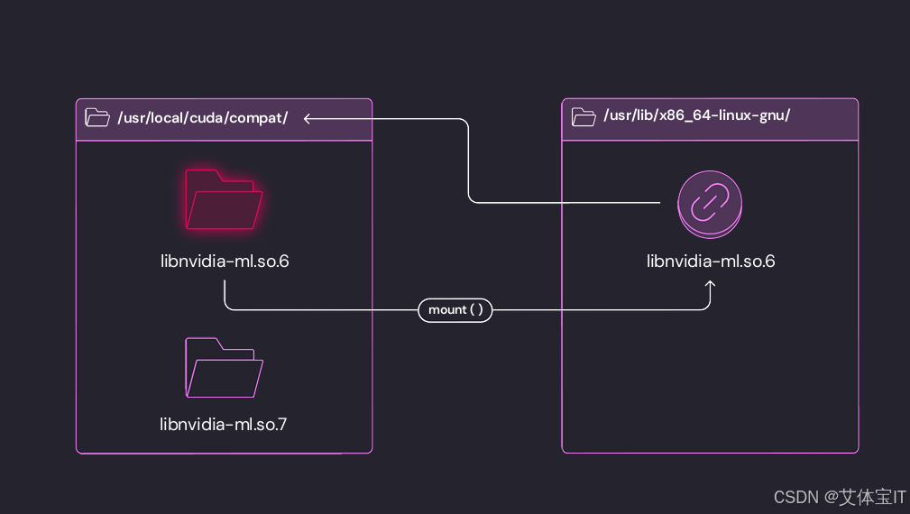 这里需要重点再说明一下,挂载通过mount()函数实现,而mount(源路径src, 目标路径dst)会实现访问dst路径时,看到的是src的内容。而在挂载libnvidia-ml.so.6时,由于/usr/lib/x86_64-linux-gnu/libnvidia-ml.so.6已经被设置为符号链接,所以mount(../../../usr/local/cuda/compat/libnvidia-ml.so.6,/usr/lib/x86_64-linux-gnu/libnvidia-ml.so.6)完成挂载之后,会使得访问/usr/lib/x86_64-linux-gnu/libnvidia-ml.so.6/libnvidia-ml.so.7的内容指向/usr/local/cuda/compat/libnvidia-ml.so.7