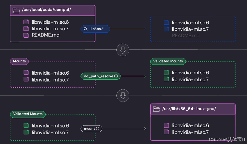 在挂载之前,也就是在做mount操作之前,NVIDIA的安全机制会通过glob匹配(通配符搜索)在/usr/local/cuda/compat路径下搜寻所有形如lib*.so.*的文件。具体到本POC中,就是libnvidia-ml.so.6目录和libnvidia-ml.so.7文件。