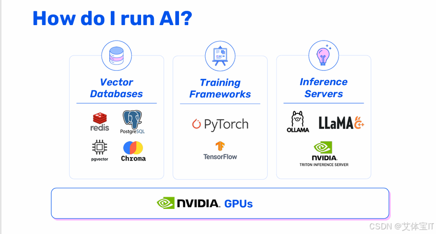 为了训练并构建一个可用的AI,我们可能需要使用向量数据库,这些数据库专门用于存储和处理向量数据,对于AI模型尤其重要,特别是在相似度搜索等任务中。常见的向量数据库有Redis、PostgreSQL等。我们还需要训练框架来训练AI模型,帮助开发者高效地创建和训练深度学习模型,例如PyTorch、TensorFlow等。最后,推理服务器可以让我们开箱即用一些预训练的模型,例如Ollama、LLaMA等。