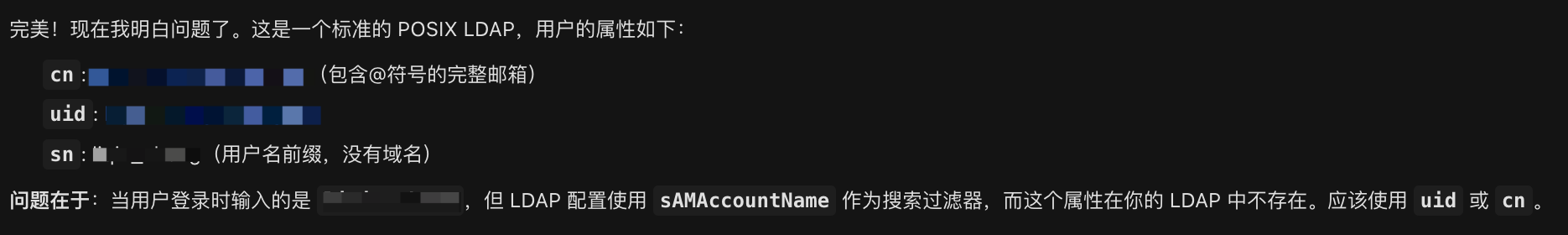 - 各种搜索:发现大部分方案都围绕着 bind_dn 或 search_filter 打转,但改了都没用。