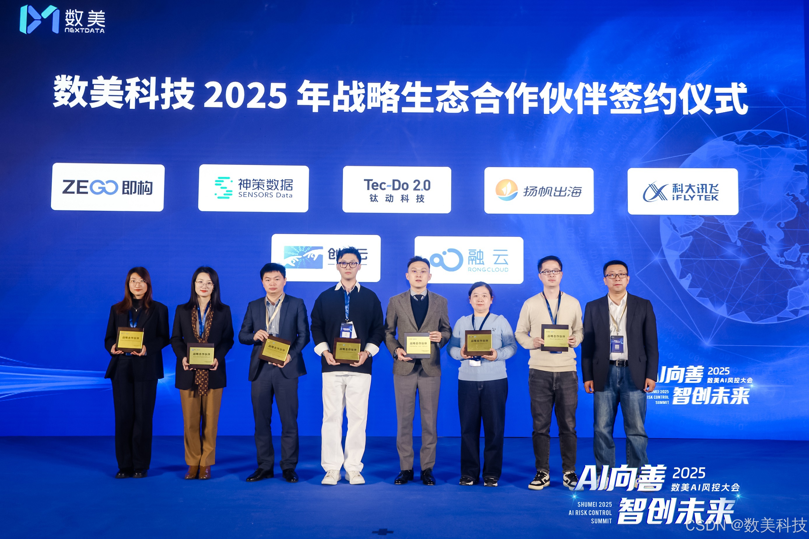 AI 时代的风险治理,需要打破孤岛,聚力共防。大会开幕式论坛,在一场隆重的生态合作伙伴战略签约仪式中进入尾声。数美科技携手科大讯飞、即构科技、神策数据、钛动科技、扬帆出海、创世云科技、融云7位行业领军伙伴,正式开启深度战略合作。