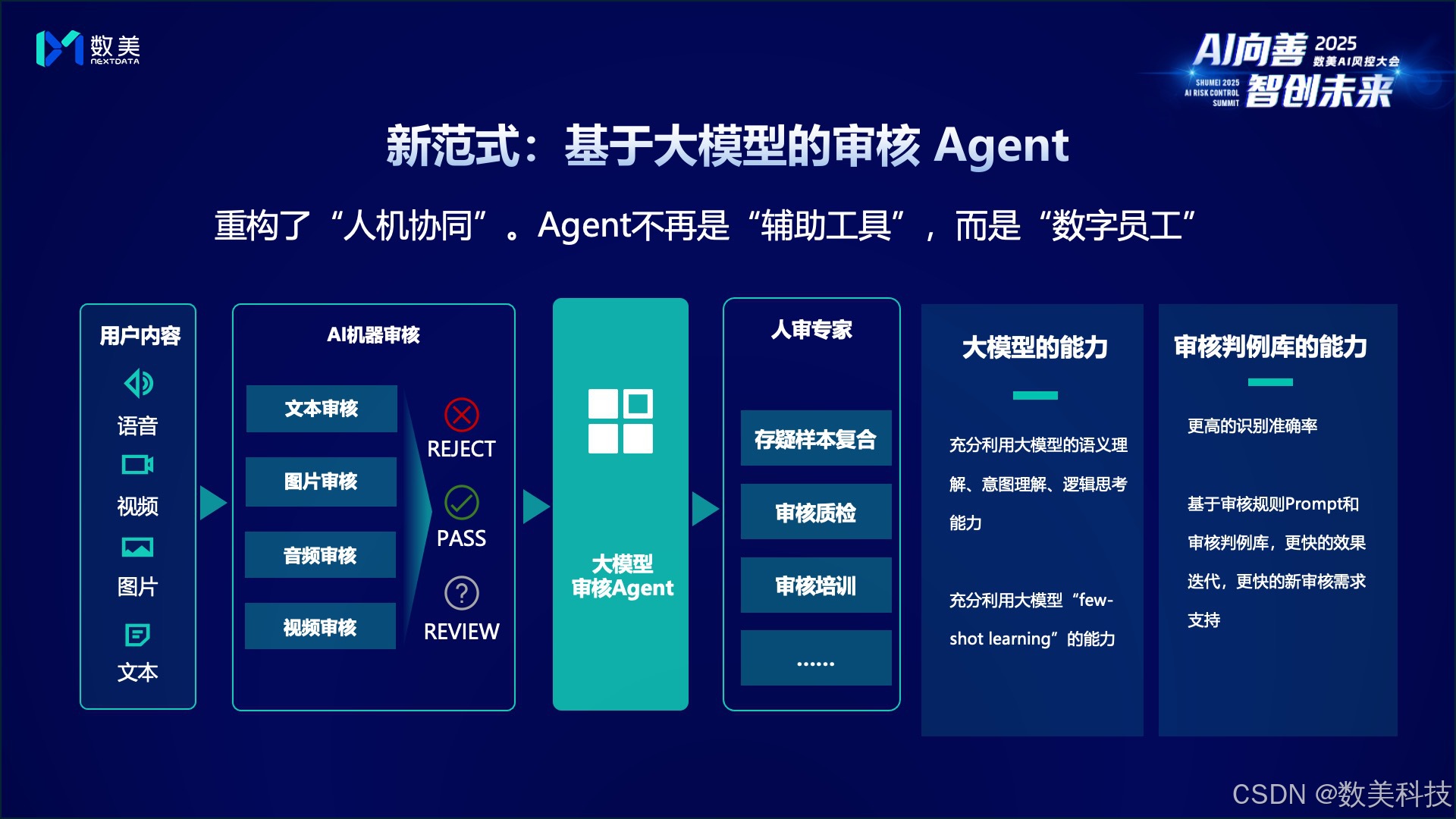 面对规模更大、语义更复杂、对抗更激烈的挑战,传统的“机审+人审”旧范式已难以为继。为此,梁堃在现场重磅发布了以“大模型审核 Agent ”为核心驱动的“ AI 风控新范式”。