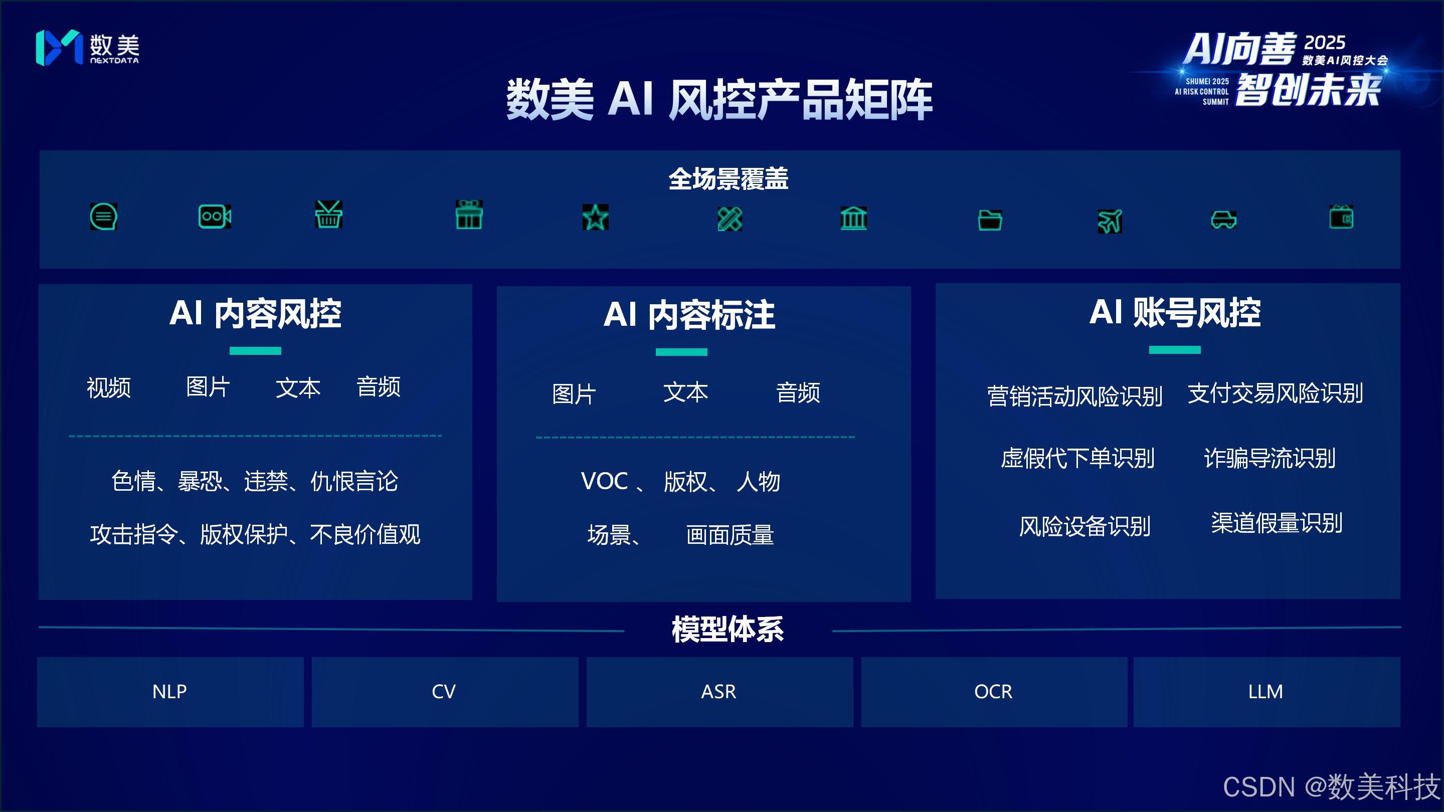 产品体系:直面风险定义与数据算法挑战,数美融合 NLP、CV 及 LLM 技术,构建覆盖全场景的 AI 风控矩阵,打造底层技术闭环;