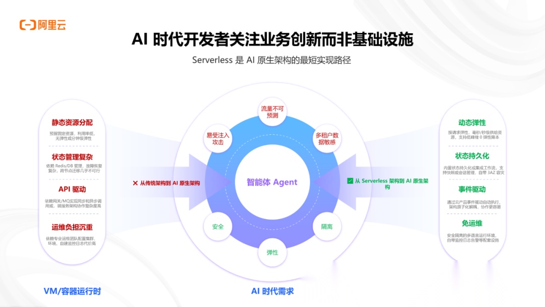 本报告聚焦2025企业级AI应用开发全流程,详解从技术选型到生产落地的关键路径。企业级AI开发正转向AI原生架构,以Serverless为最优运行时,通过毫秒级冷启动、GPU切分等技术解决高并发、高成本痛点。阿里云FC、SAE等产品已形成成熟解决方案,在吉利汽车等案例中实现算力成本优化33%以上、开发效率提升50%。未来AI开发将朝着简单易用、安全高效、弹性低成本方向演进。