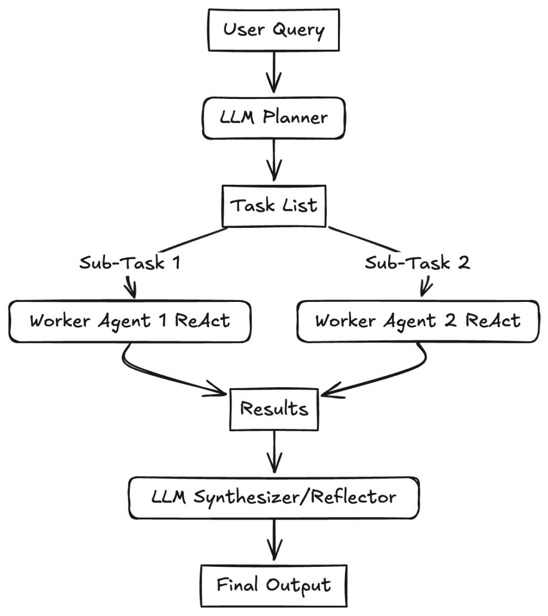 由中央规划者大语言模型将复杂任务拆分为动态子任务列表,再将这些子任务分配给专用执行者智能体(通常结合工具使用模式)执行。该模式通过生成初始计划,解决需要多步推理的复杂问题,初始计划会根据用户输入动态生成。随后,子任务被分配给执行者智能体执行,若子任务之间无依赖关系,可并行处理。