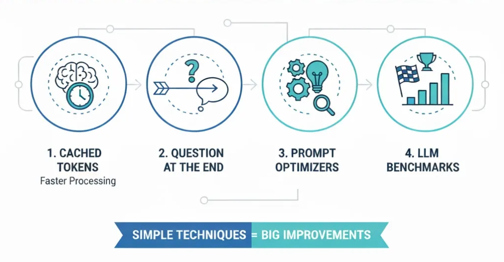 这张信息图突出了本文的主要内容。我将讨论四种不同的技术,可显著提升你的 LLM 应用在成本、延迟和输出质量方面的表现。具体包括:利用缓存 token、将用户问题置于提示末尾、使用提示优化器,以及建立你自己的定制化 LLM 基准测试。(图片由 Gemini 提供。)
