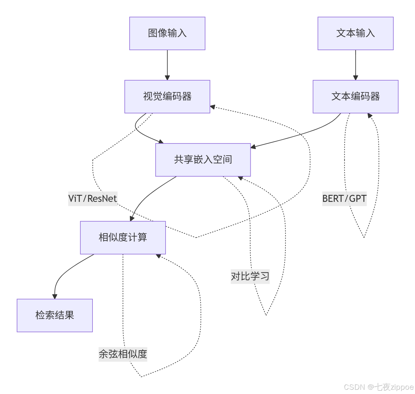编码器设计:视觉编码器通常采用Vision Transformer或ResNet架构,文本编码器选用BERT或GPT系列模型。关键创新在于双流架构的参数共享机制——通过投影层将异构特征映射到相同维度空间。