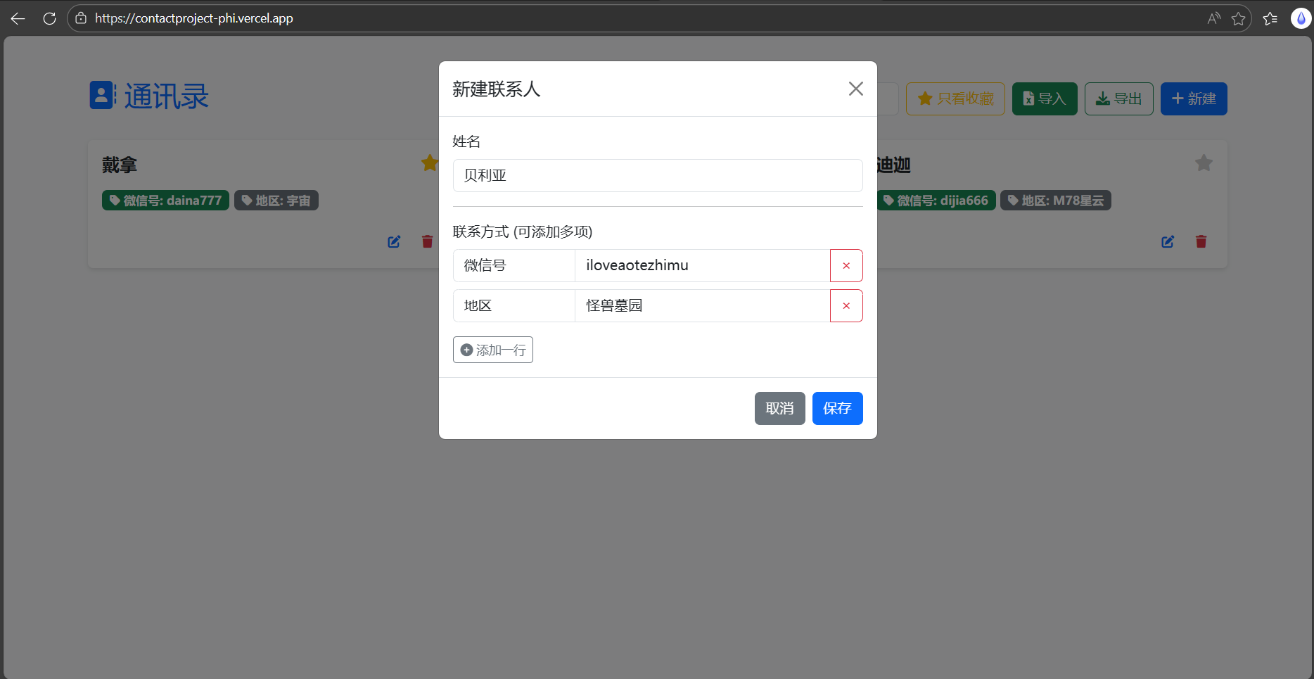 输入联系人姓名,联系方式可添加多项(不仅限于示例中的微信号与地区):