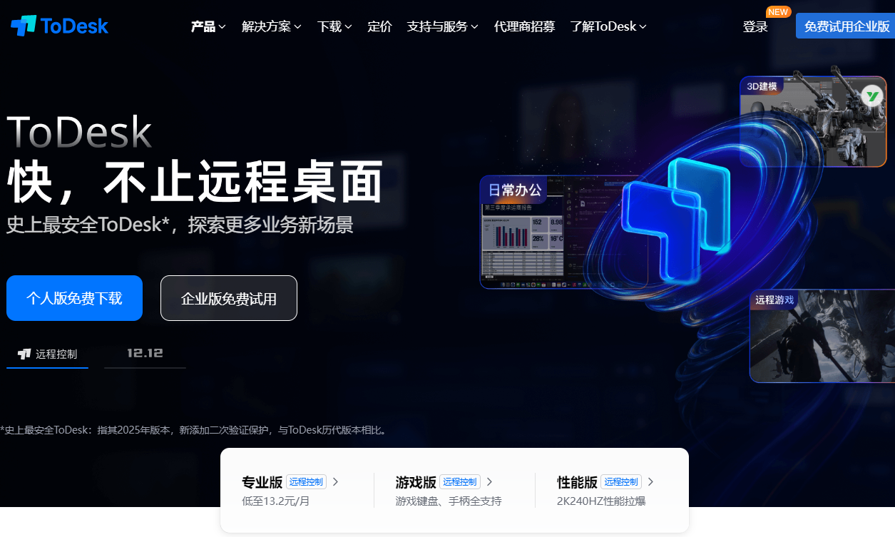 突出优势与最新功能:国内专业远控代表,自研ZeroSync引擎,支持2K240帧/1080P360帧超高帧率;独创“文件中心”和“游戏与应用中心”,无需远程桌面直接操作文件与应用。