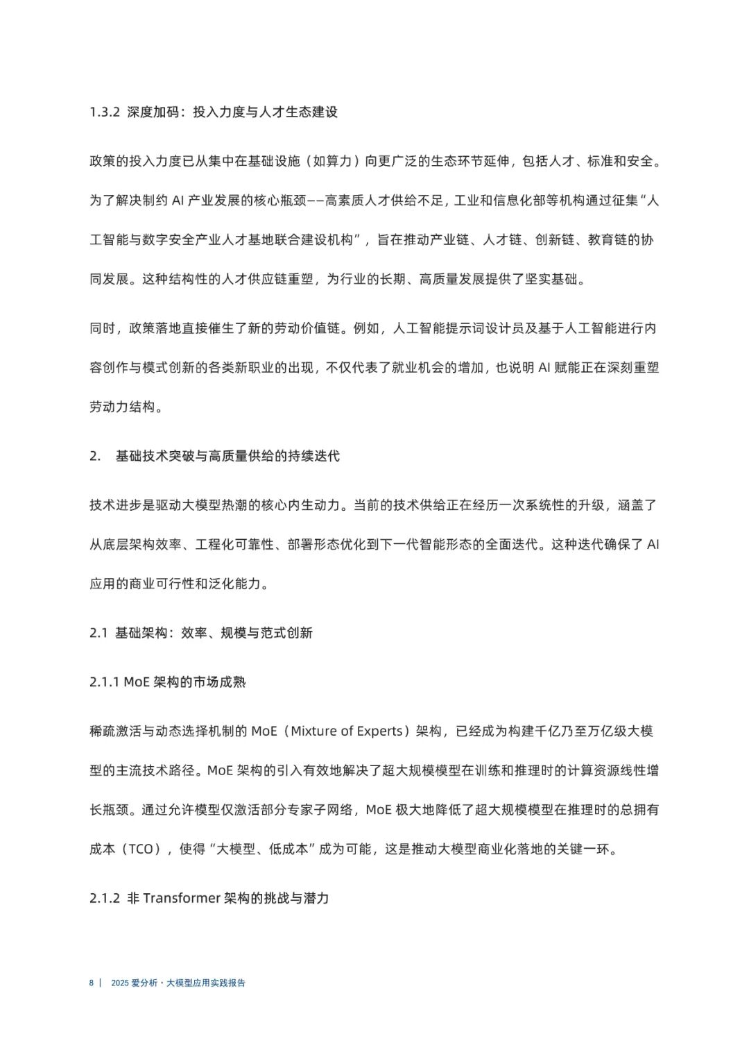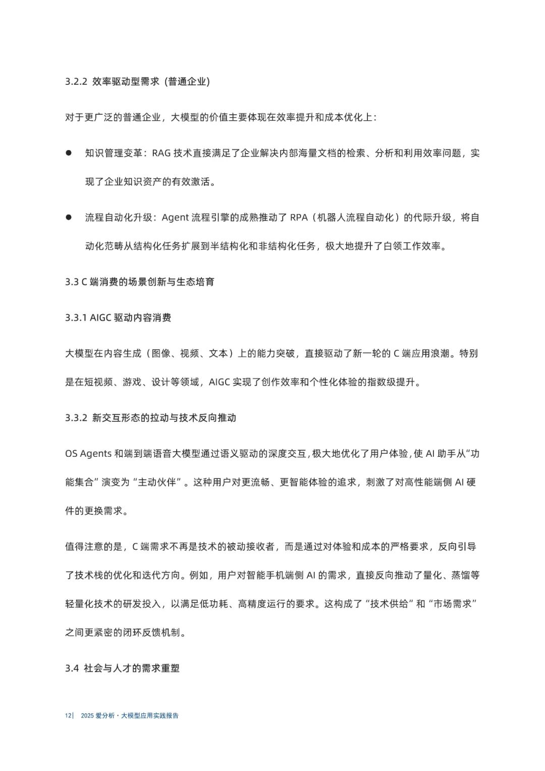 - 技术供给:MoE架构、RAG、Agent、世界模型等技术推动大模型从“可用”走向“可靠”。
