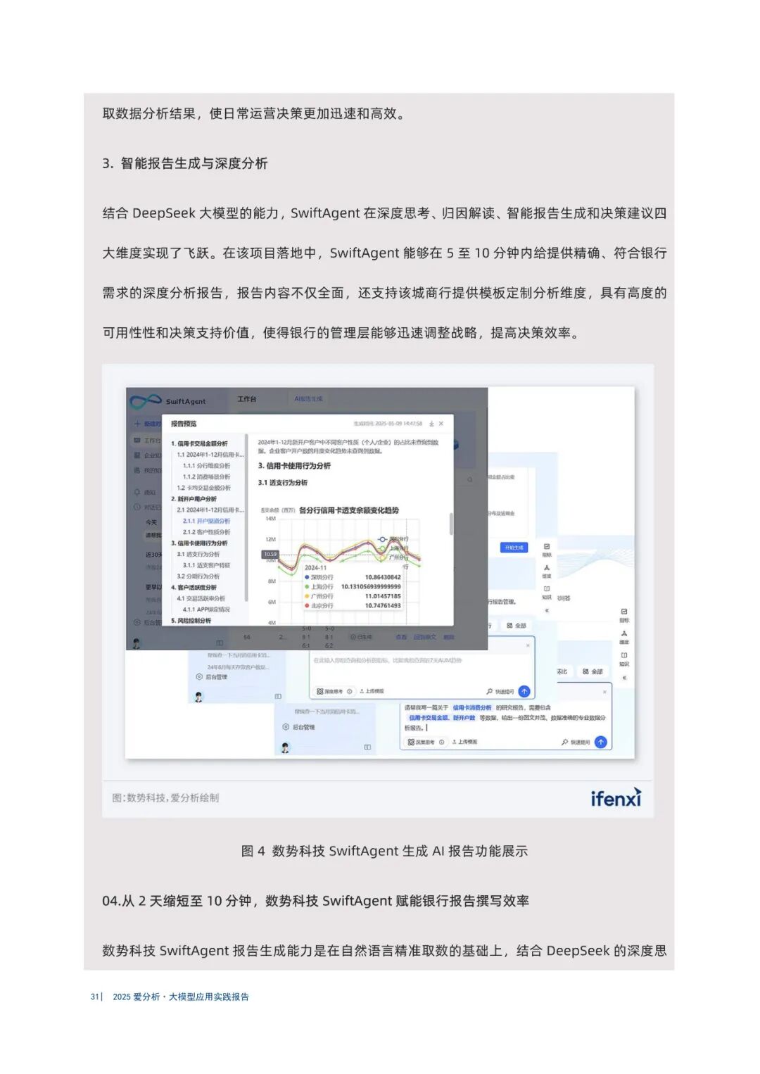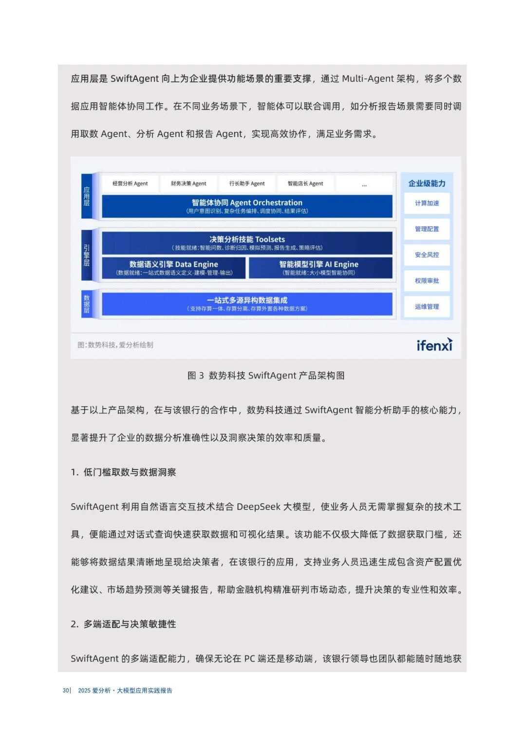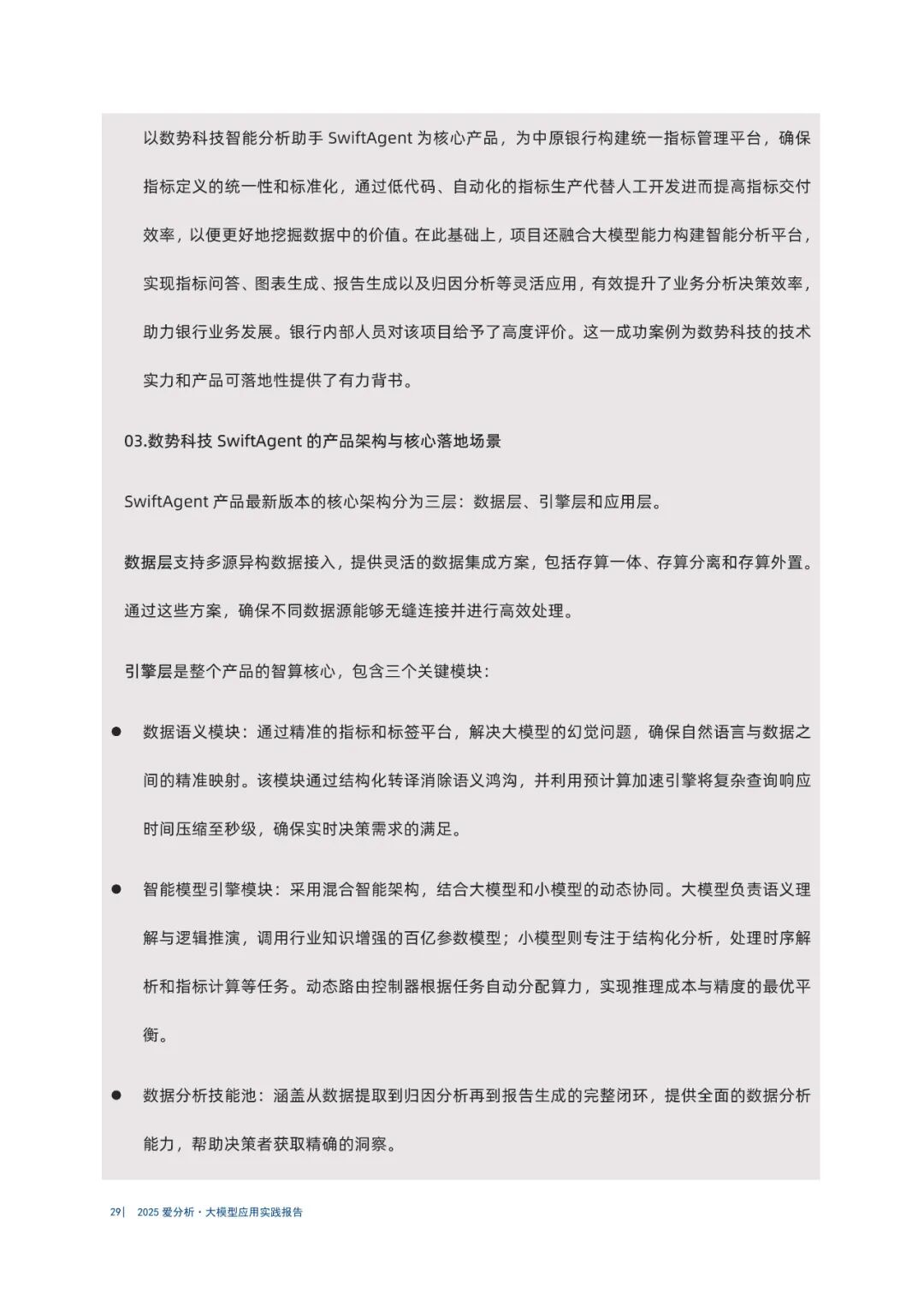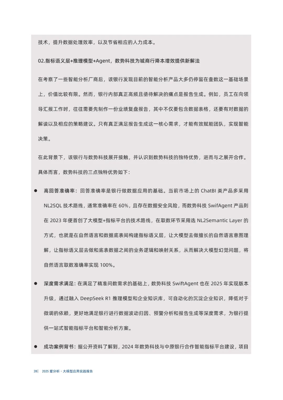 - 对话式智能分析:提出六大成功要素,包括价值定位、技术架构、信任构建、场景选择等,并结合城商行案例(数势科技SwiftAgent)说明如何实现从“取数”到“报告生成”的跨越。