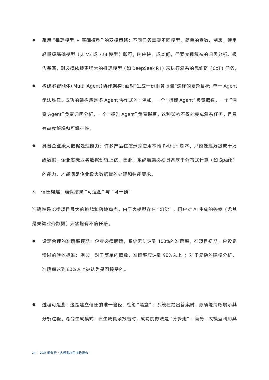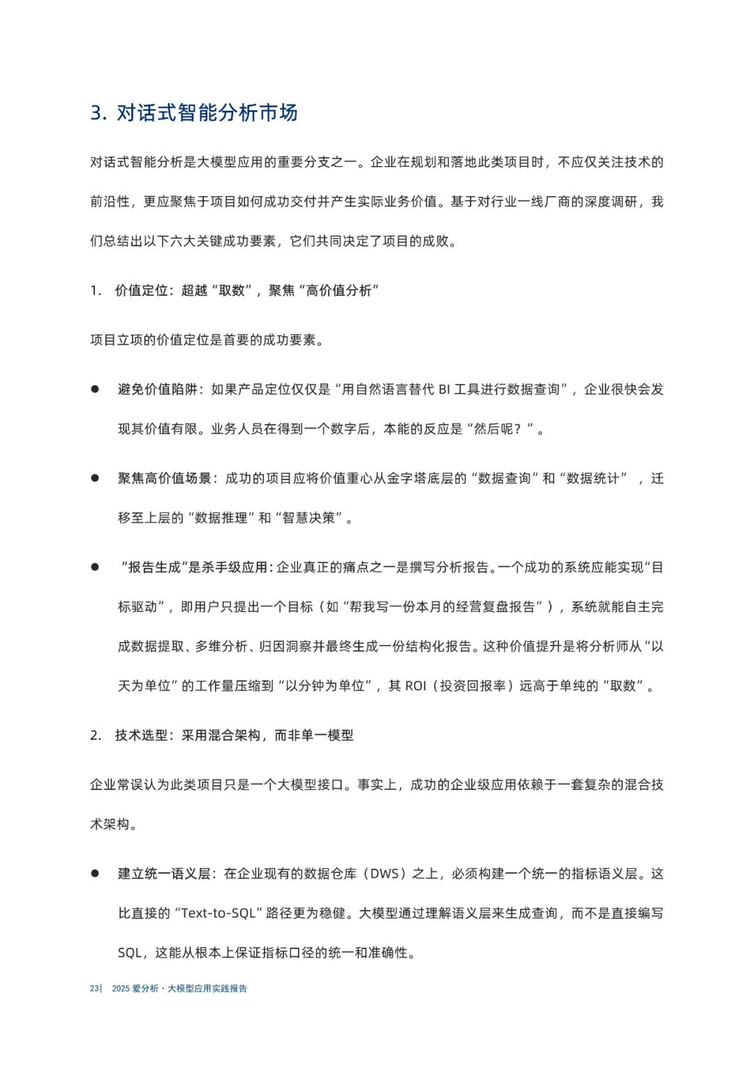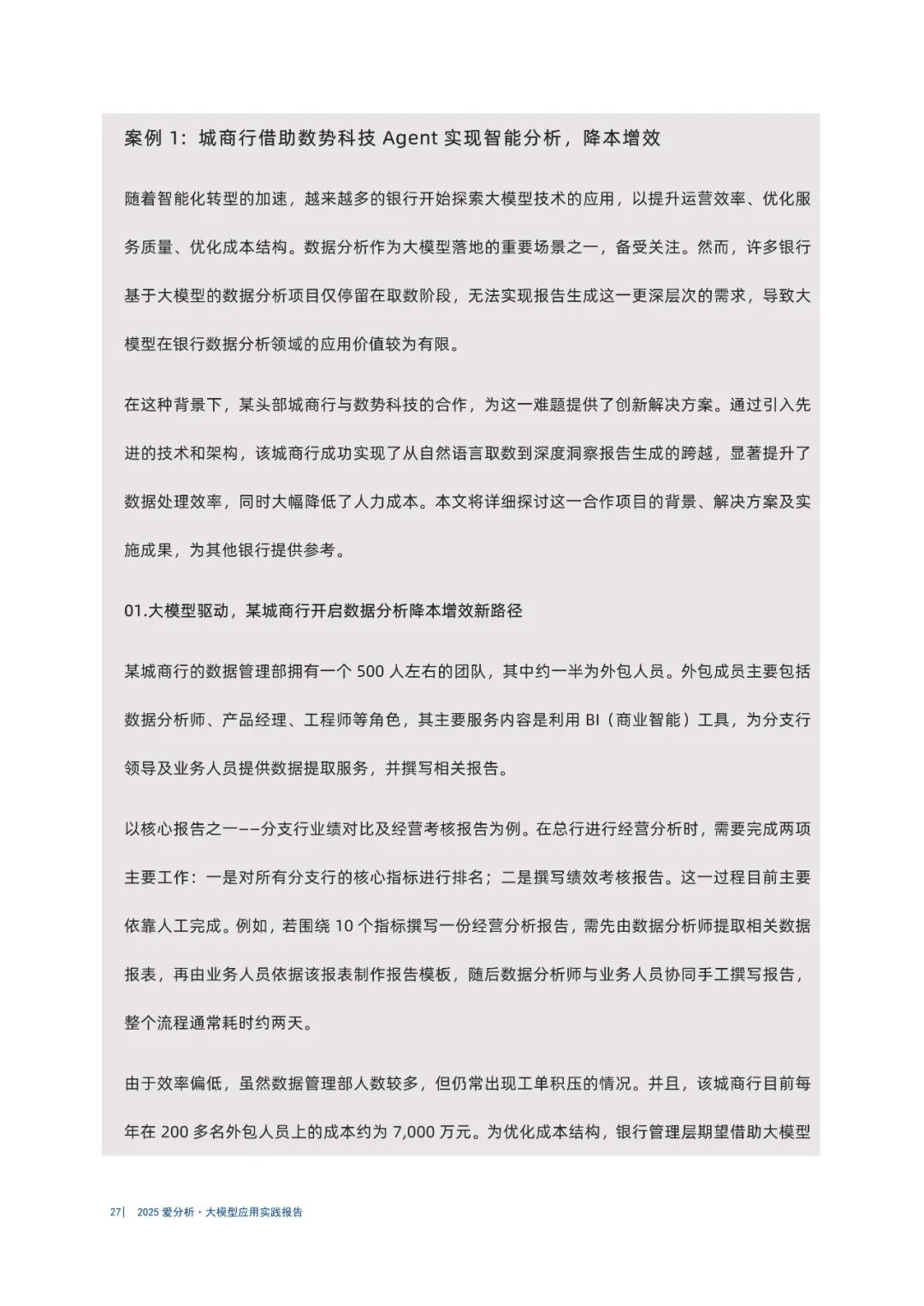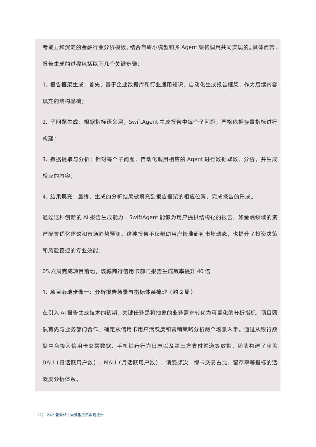 - 对话式智能分析:提出六大成功要素,包括价值定位、技术架构、信任构建、场景选择等,并结合城商行案例(数势科技SwiftAgent)说明如何实现从“取数”到“报告生成”的跨越。