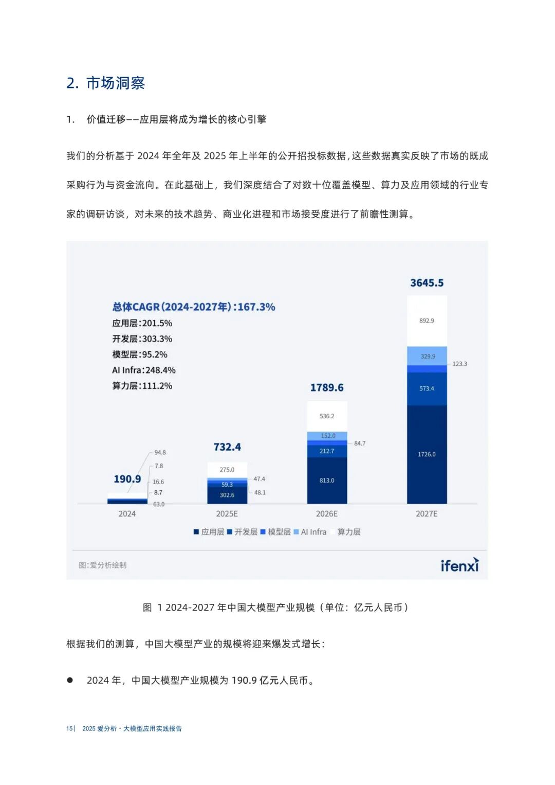爱分析发布的大模型应用实践报告采用"政策-技术-需求"三维框架分析中国大模型市场。到2027年,产业规模预计达3645.5亿元,应用层将成为最大市场板块(CAGR 201.5%),价值重心从基础设施转向场景落地。报告深度剖析了对话式智能分析和政务AI等典型应用场景,并提供了企业选型策略,兼具前瞻性与实操性。