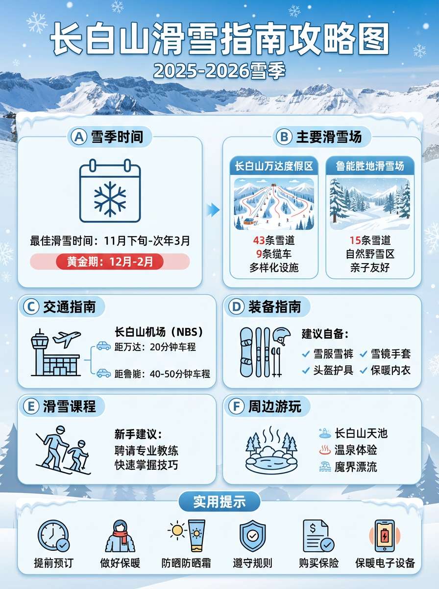❝生成一张长白山滑雪指南攻略图,中文,要求有详细的攻略