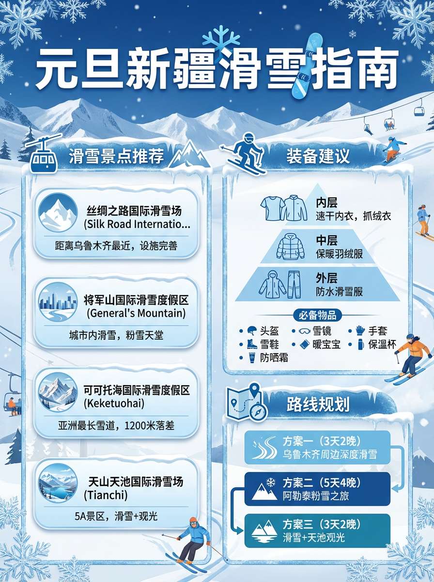 ❝生成一张元旦去新疆滑雪指南攻略图,中文,要求有详细的攻略