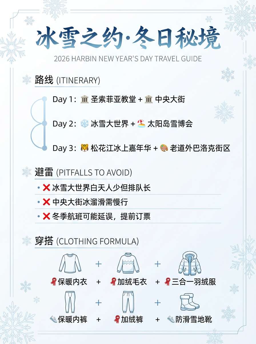 你现在是我的旅行内容主编。我们需要制作一张关于“2026元旦哈尔滨极简攻略”的信息图海报。