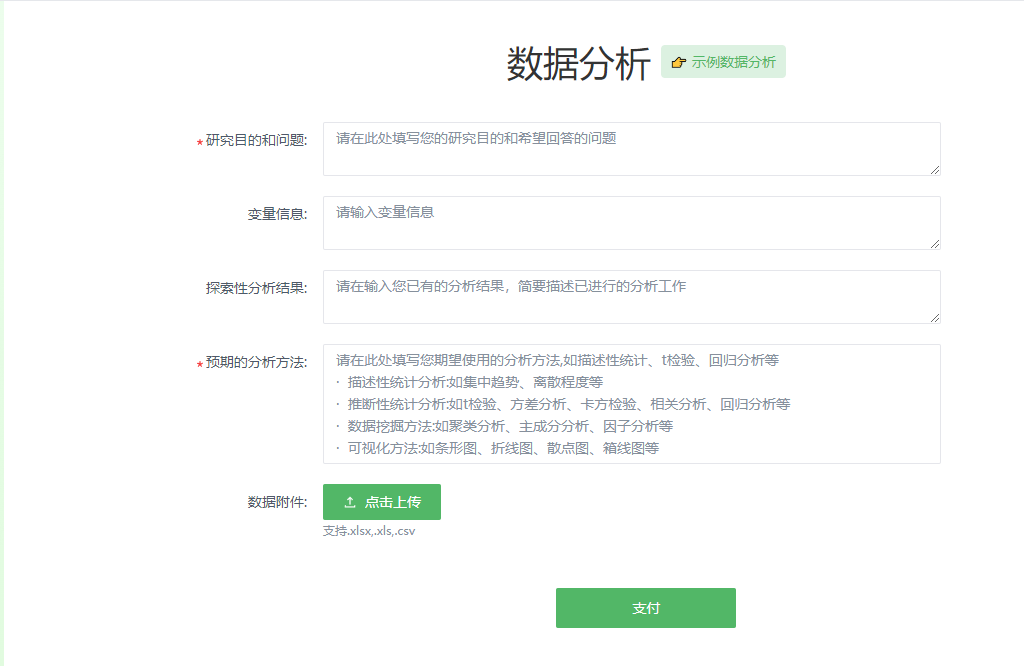 - 探索性分析结果(可选):如果你已有初步分析结果(如均值、标准差),可在此输入,便于系统理解数据背景。