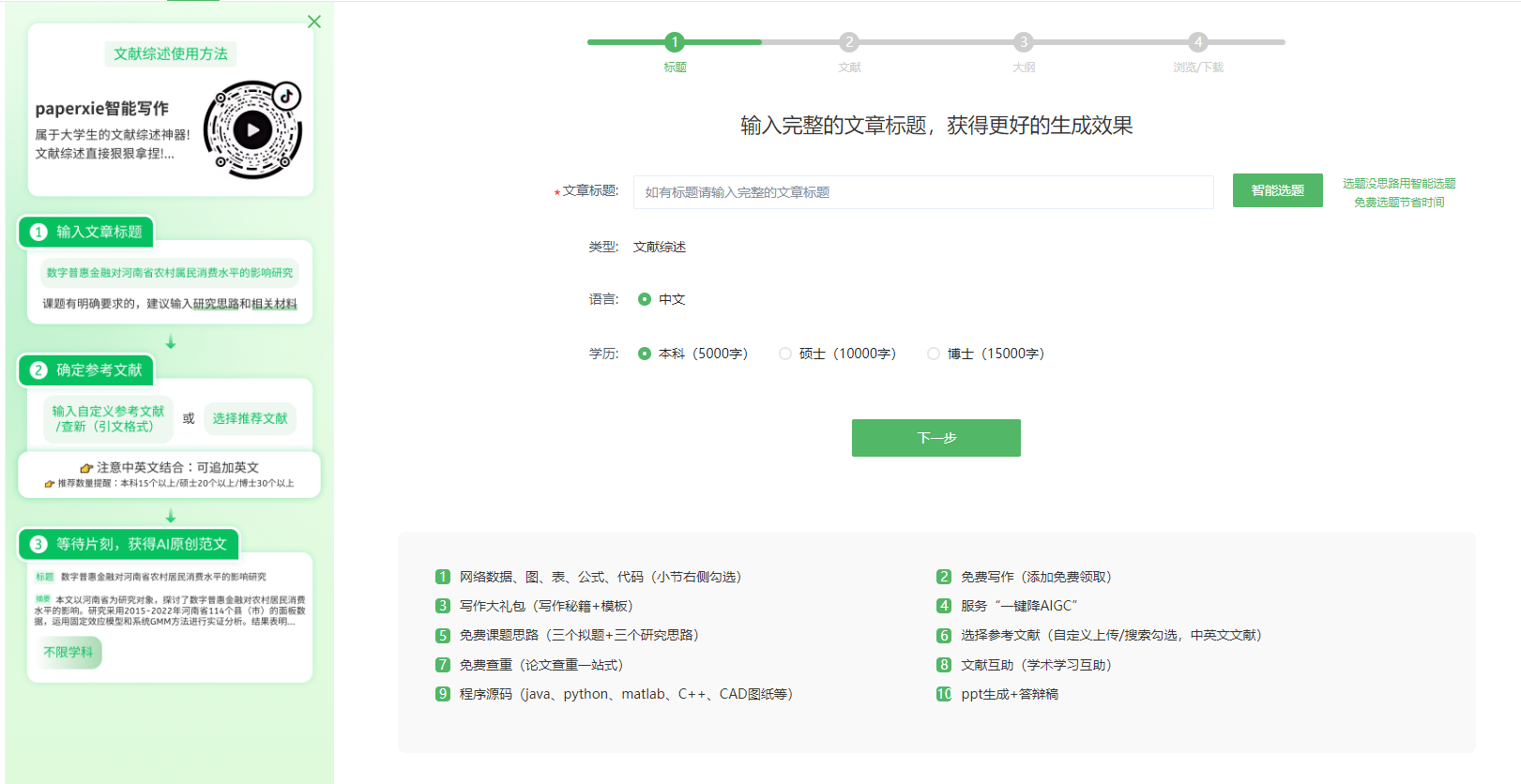 - 你只需要在 “文章标题” 栏输入你的选题(比如 “数字普惠金融对农村消费的影响”),选择学历(本科 / 硕士 / 博士),它会先帮你筛选出 “与选题强相关的核心文献”(不是随便搜几十篇,而是优先匹配近 3 年核心期刊、高被引文献);