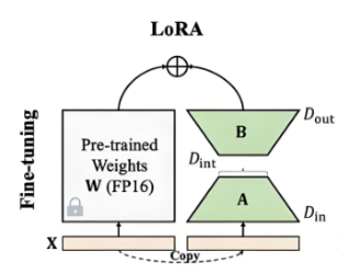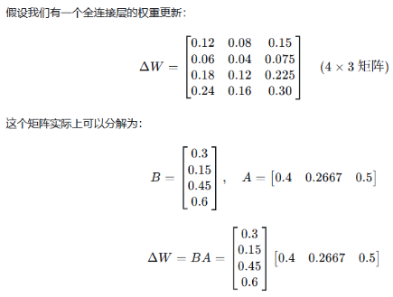 公式表示:W' = W + BA,其中秩 r << 原矩阵维度