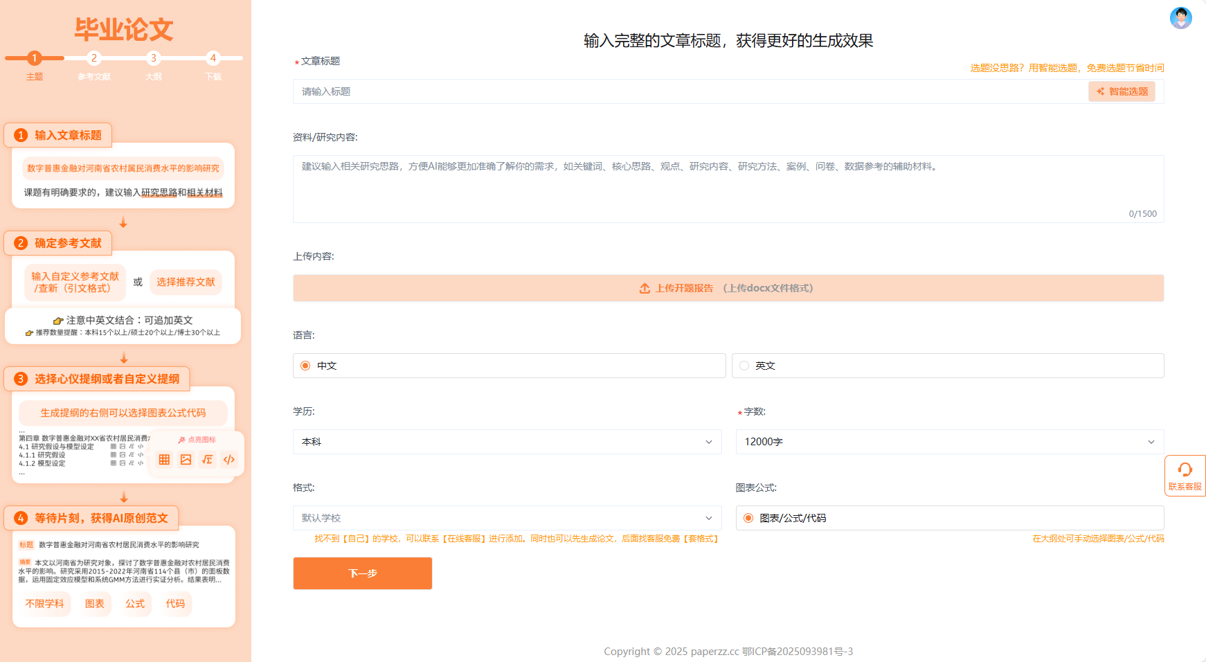 - 选题环节:用 “限定式标题模板”(比如 “XX 变量对 XX 群体的 XX 影响 —— 以 XX 区域为例”)帮新手避开 “选题太泛” 的坑,搭配 “智能选题” 功能生成带地域、变量限定的方向;