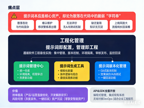 摘要:JBoltAI提出提示词工程化管理方案,将传统开发中零散嵌入代码的提示词升级为可配置、可迭代的独立资产。该方案以集中化管理、结构化设计和版本控制为核心,实现提示词的全生命周期管理,支持热更新、灰度发布和效果评测,大幅提升AI应用迭代效率。通过将提示词从"临时字符串"转化为可沉淀的智能资产,企业能够持续优化AI能力并积累业务知识,为AI应用从原型验证到企业级落地提供关键支撑