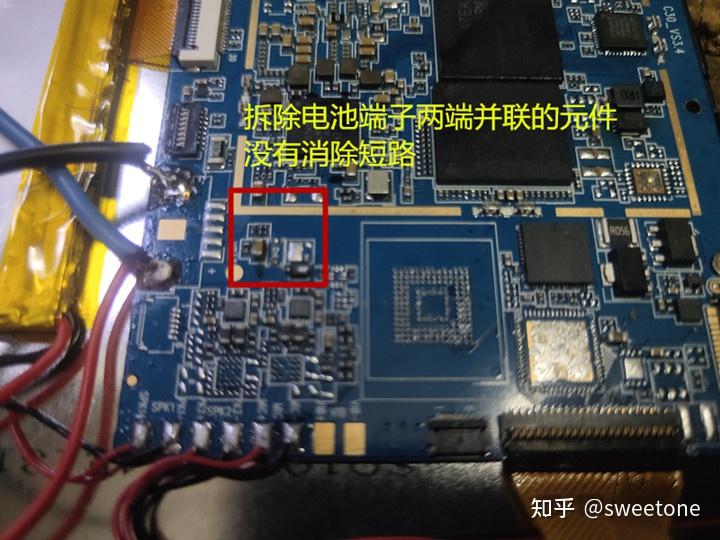 拆开该平板电脑外壳,焊下锂电池与主板的连接线,使得电池与主板无物理连接。测量主板的电池Vbat正负端子之间阻值接近短路,只有16欧姆。