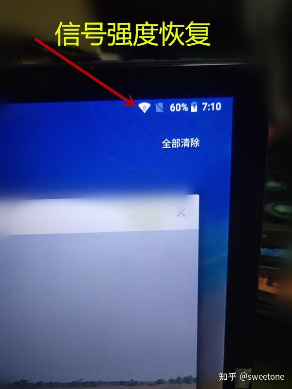再开机,打开该平板电脑的WLAN设置,发现其他邻居的WI-FI信号都已经可以看到(名称,信号强度都已经出现)。接收自己家WI-FI的信号强度也变正常了。机器离无线路由器有三四个房间距离时,信号也较好,联网看视频很流畅。