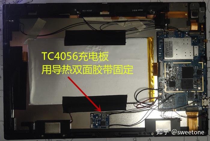为了验证分析是否准确,利用手头有的TC4056锂电池线性充电板(淘宝价格不到一元)来代替丝印P10开关型充电芯片接入主板,看整机能否恢复正常工作。为了保证机器EMI电磁兼容性能,拆下的屏蔽罩是要盖上的。所以不方便将5V供电线,接地线,电池Vbat充电线接在丝印P10开关型充电芯片的焊盘上。于是,在屏蔽罩外找到5V,GND,Vbat这三个焊接点,用导线接到TC4056锂电池线性充电板上。为了充电板的散热,以及充电板的绝缘,将充电板用绝缘导热双面胶带粘在液晶屏铁壳上。