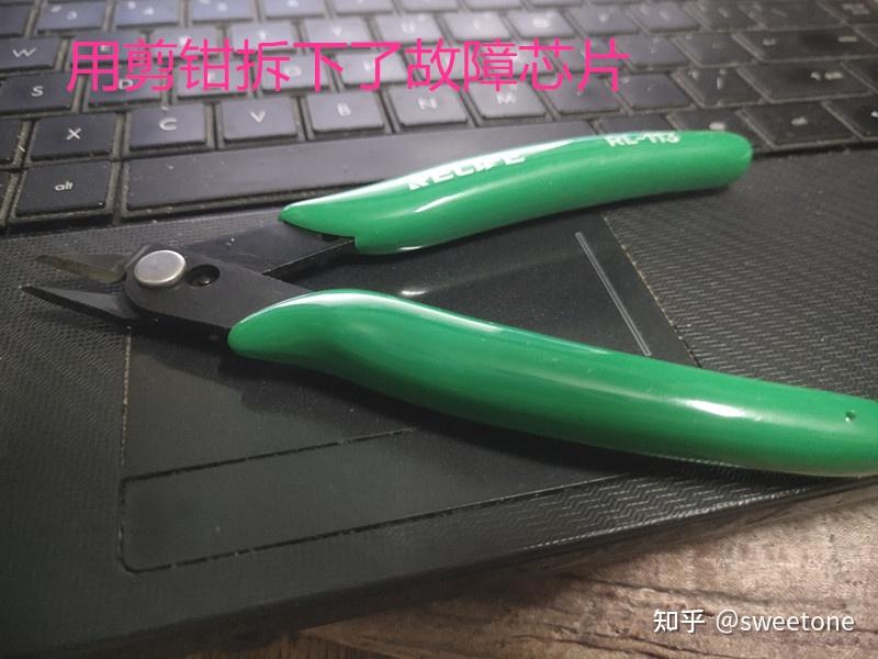 然后拆下主板再继续拆。为了防止高温使得4G内存加64G闪存芯片虚焊,在此芯片上粘上隔离高温的胶带。然后,用热风枪再对要拆的那个发热芯片边加热边用刀片撬,撬芯片好几分钟还是撬不下来。为了防止内存闪存芯片虚焊,只得放弃热风枪拆焊。最后用尖嘴剪钳将发热的芯片剪了下来。原来该芯片底部有散热片和主板焊在一起,怪不得这么难拆。