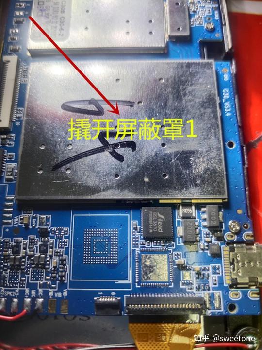 由于贴片电容漏电是常见故障,决定用烧机法把故障电容烧开路或暴露其位置。将5V2A电源串联IN5408二极管,输出4.2V左右的电压。将该4.2V电压的正负线接主板上的电池正负端子。通电一段时间,主板屏蔽罩1就发热厉害。不过通电一二十分钟,该4.2V电压还是不能将短路点烧开路。所以断开4.2V电源。决定拆开屏蔽罩看一下里面发热的元件。该屏蔽罩是用卡扣固定在主板上的,用细的刀片就能将其撬下,避免了用热风枪拆焊屏蔽罩的麻烦