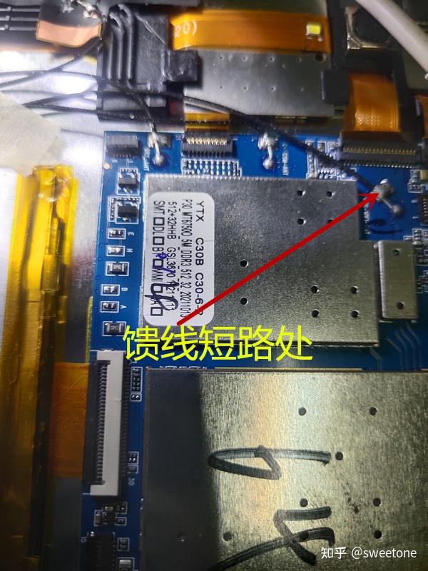 原来前面维修拆装时,不慎将主板侧馈线信号端与馈线屏蔽层之间的绝缘层损坏而引起短路,使得天线阻抗不匹配,天线信号衰减,所以造成机器WI-FI信号灵敏度变低的异常情况。