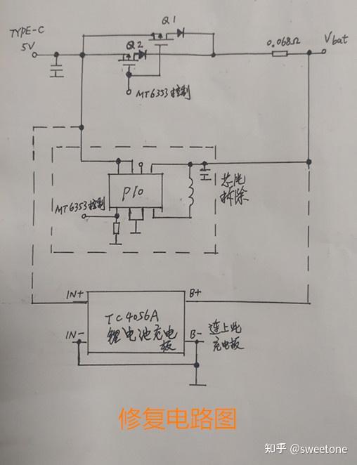 从实测电路图可以分析该芯片是开关型充电芯片,用以关机时或功耗低时给锂电池充电。而在开机及功耗大时,电路控制Q1,Q2导通,将5V电压降压到4.2V,给锂电池充电。依靠这两个大功率管提供部分旁路电流,提高开关型充电芯片带负载能力。