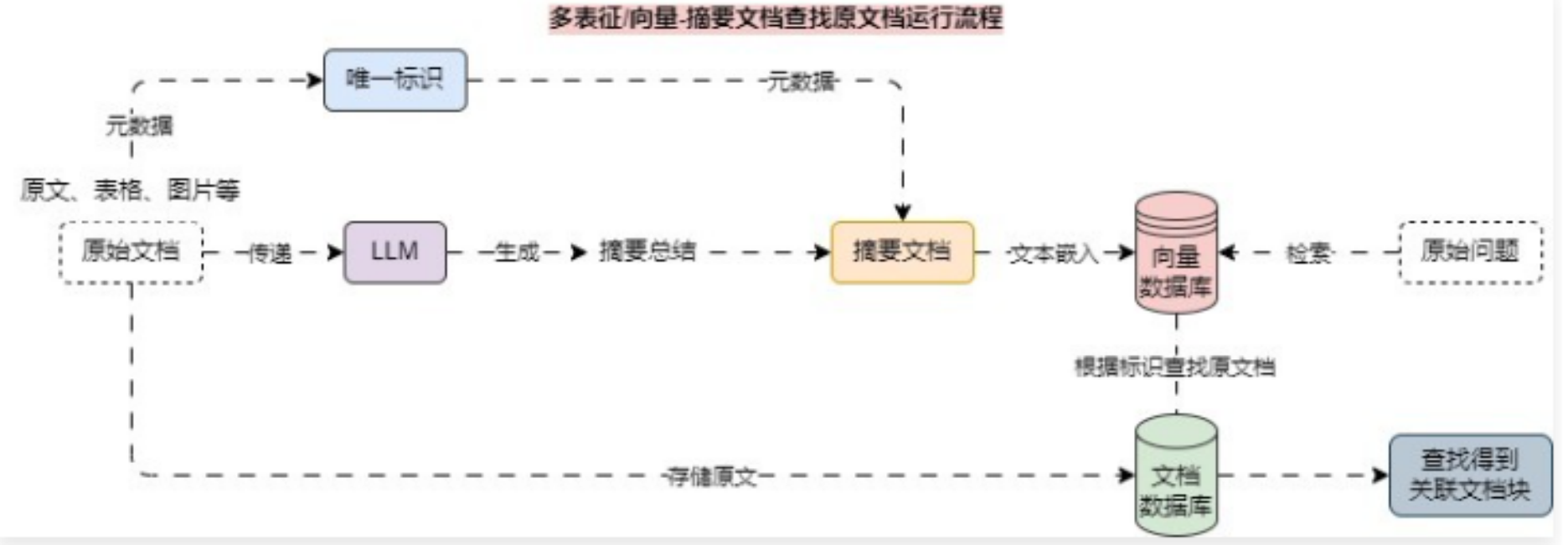 通过这种方式可以为一个文档块生成多条特征/向量,在检索时能提升关联文档被检索到的概率,多向量检索的运行流程其实也非常简单,以 摘要文档 检索 原文档 为例,运行流程图如下