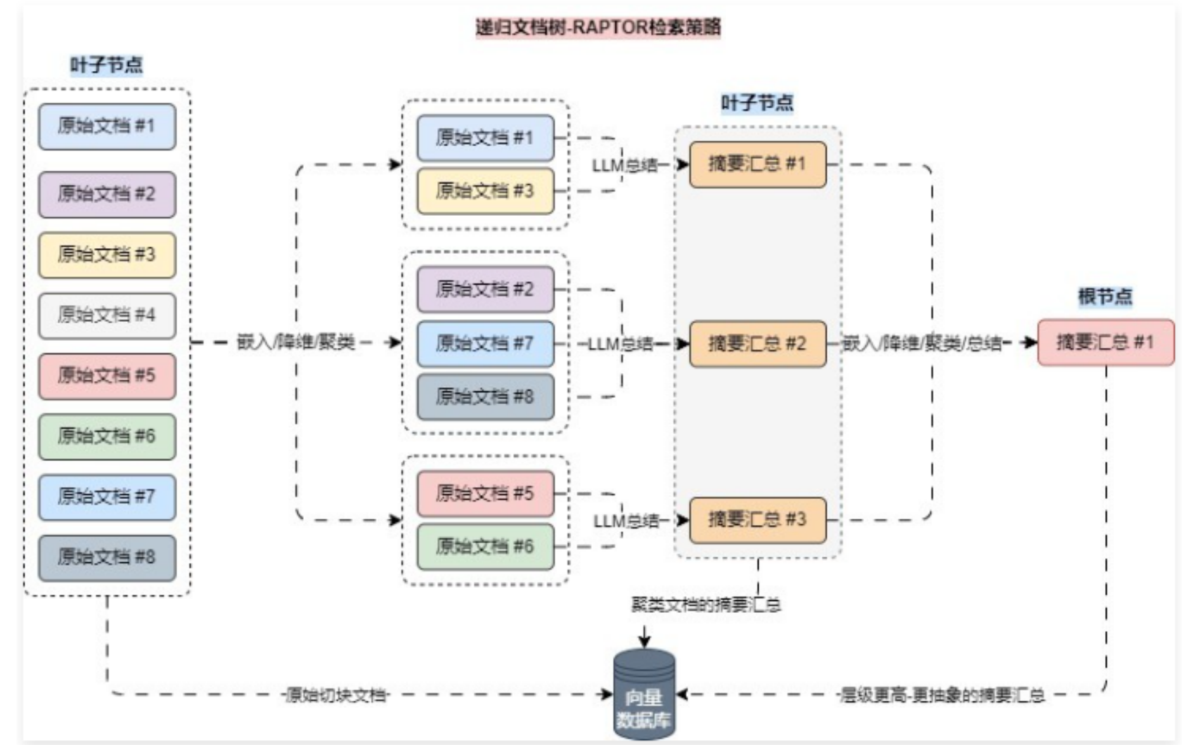 RAPTOR 其实是一种用树状组织检索的递归抽象处理技术,它采用了一种自下而上的方法,通过对文本片段(块)进行聚类和归纳来形成一种分层结构,该技术在 https://arxiv.org/pdf/2401.18059 论文中被首次提出。