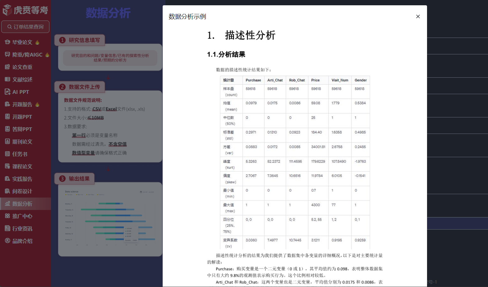 - 操作:进入虎贲等考 AI “数据分析” 模块,上传数据→选择研究目标(如 “描述统计”“差异比较”“关联分析”“因果分析”)→点击 “一键分析”;