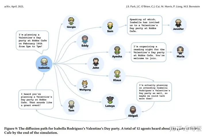 为了支持该实验,该团队创建了一个用于存储记忆的平台,并为每个代理提供目标的基本提示。之后,AI 代理就可以分享信息,记住彼此关系的细节,甚至可以策划情人节派对。
